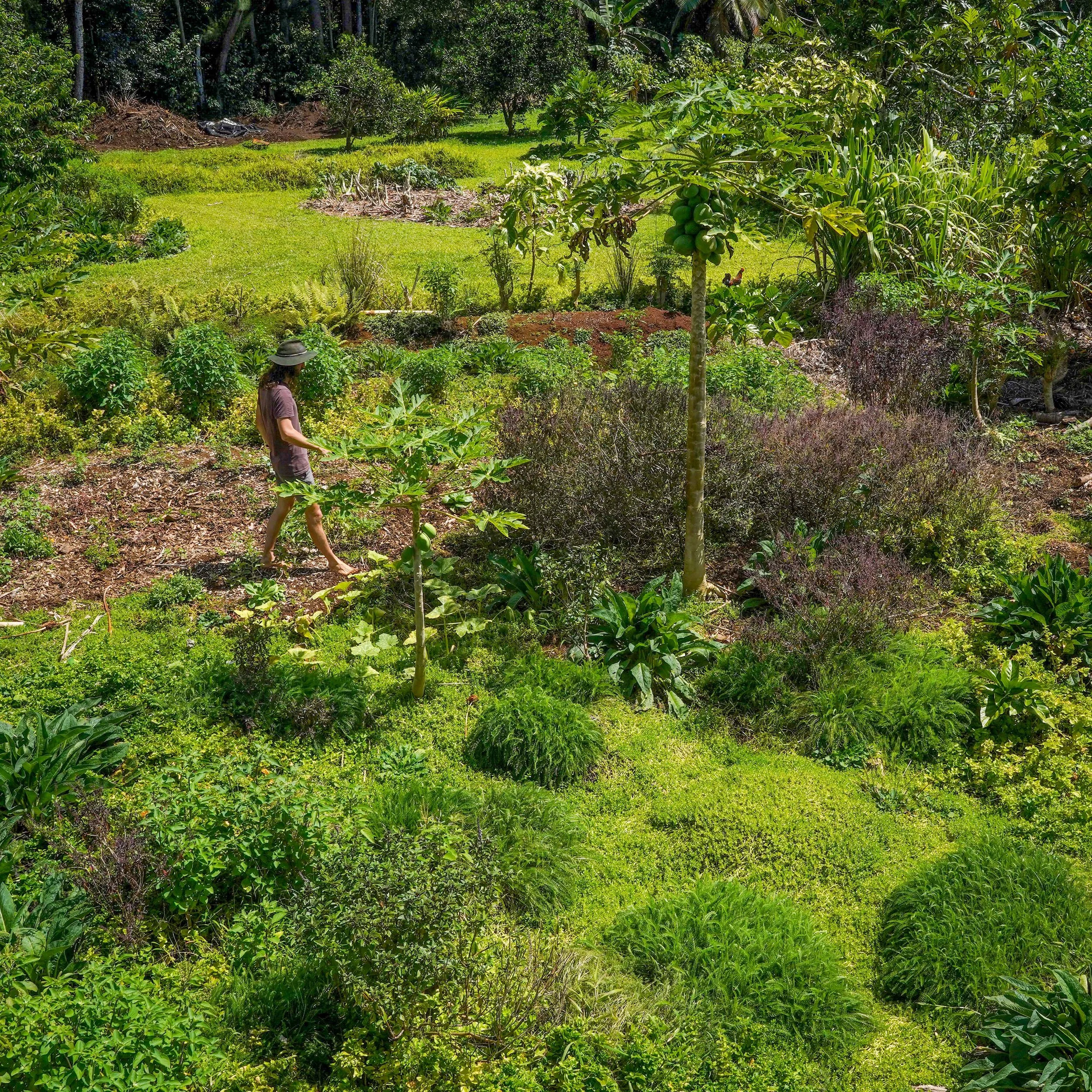 As I walk through these jungle medicinal gardens, I first pick and taste the calming, mushroom-flavored, purple vervain flowers. I then try the peppery zest of the ripened all-spice berry, and as the potent flavor heightens my sensory system, my eyes are drawn to the garden floor and the yellow-flowered, supple tarragon bed beneath me. I gently pick some and taste its licorice flavor. Afterwards, I spot some rich, ruby red coffee beans and eagerly pop a few of these fruity antioxidant skins into my mouth. I lean over to waft the calming fragrance of the enchanting Tulsi flower while lightly stepping barefoot on the carpet-like, green ground cover of Self-Heal and Laukahi. I breathe deeply before rubbing the potent antiseptic oils directly from the needle-leaves of the Tea Tree Plant.